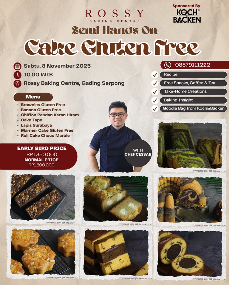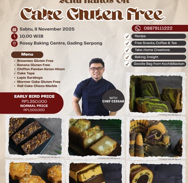 Semi Hands On Class with Chef Cessar! Dalam kelas ini kamu akan mempelajari 7 jenis Cake Gluten Free! Buat kamu yang ingin makan roti namun tetap gluten free, kelas ini cocok banget buat kamu!