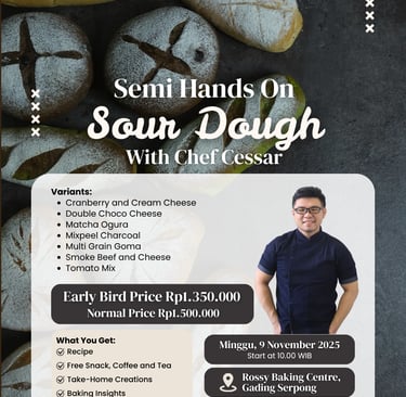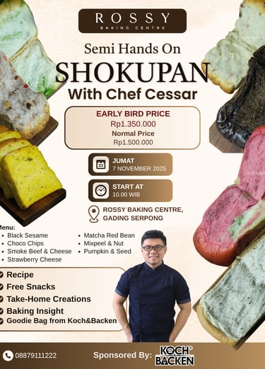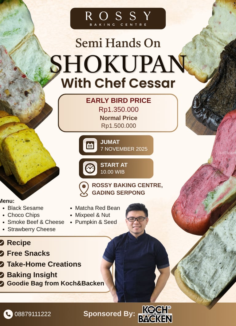 Semi Hands On Class with Chef Cessar! Dalam kelas ini kamu akan mempelajari 7 jenis Roti Tawar Jepang yang lembut di mulut yang pastinya bikin ketagihan!