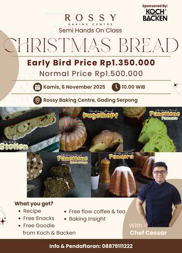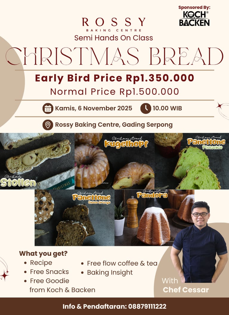 Semi Hands On Class with Chef Cessar! Dalam kelas ini kamu akan mempelajari 5 jenis Christmas Bread yang bikin ketagihan! Buat hari Natal mu makin spesial!