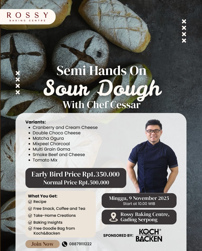 Semi Hands On with Chef Cessar! Kamu akan mempelajari cara membuat Sour Dough Bread from Scratch! Dapatkan goodie bag spesial dari Koch & Backen!